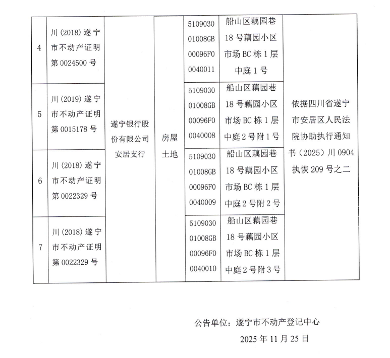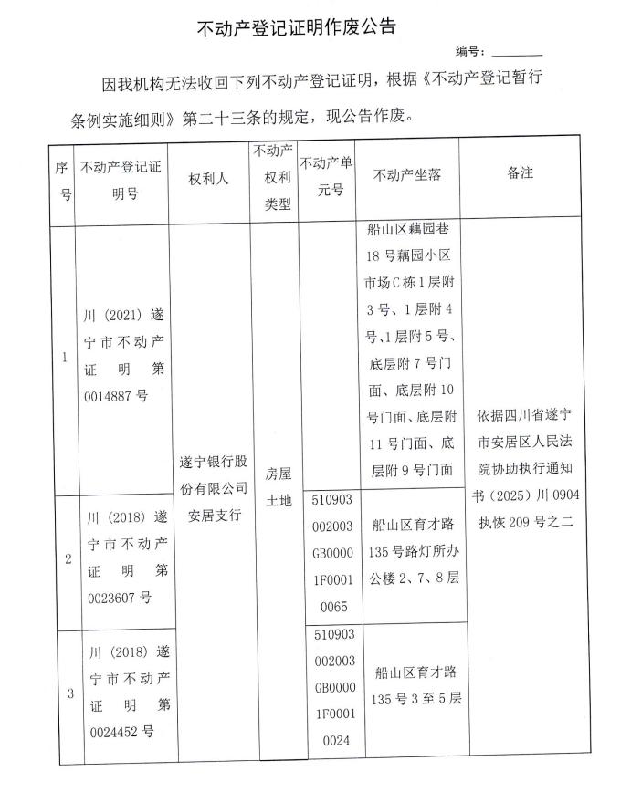 不动产登记证明作废公告(遂宁银行股份有限公司安居支行)
