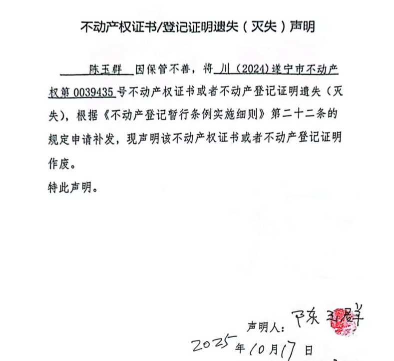 不动产权证书/登记证明遗失(灭失)声明(陈玉群)