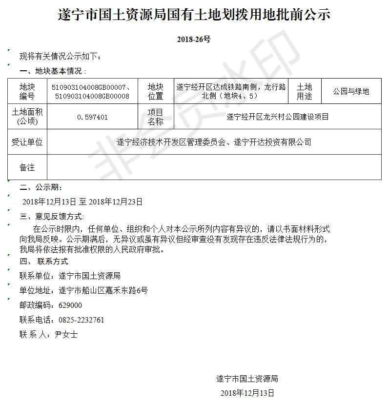 遂宁市国土资源局国有土地划拨用地批前公示(2018-26号)