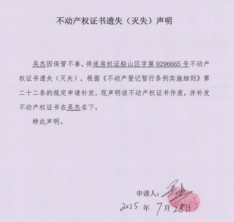 不动产权证书遗失(灭失)声明(吴杰)