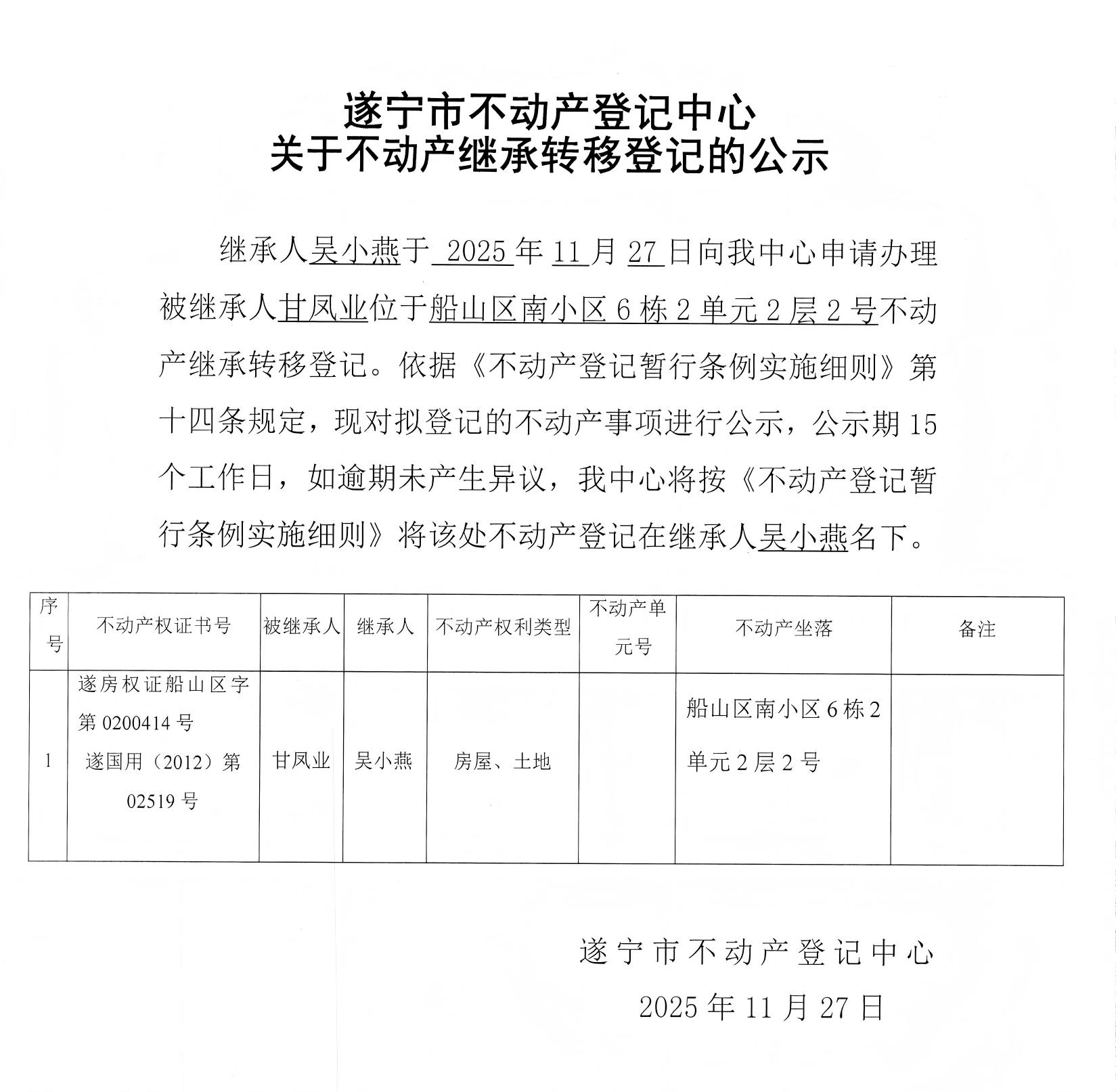 遂宁市不动产登记中心关于不动产继承转移登记的公示(吴小燕)