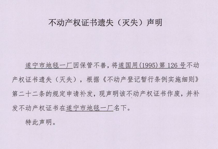 不动产权证书遗失(灭失)声明(遂宁市地毯一厂)