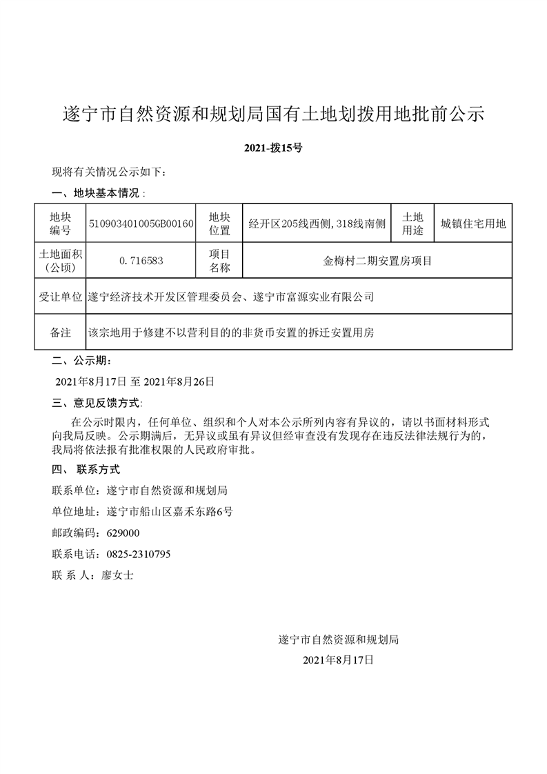 遂宁市自然资源和规划局国有土地划拨用地批前公示 2021-拨15号