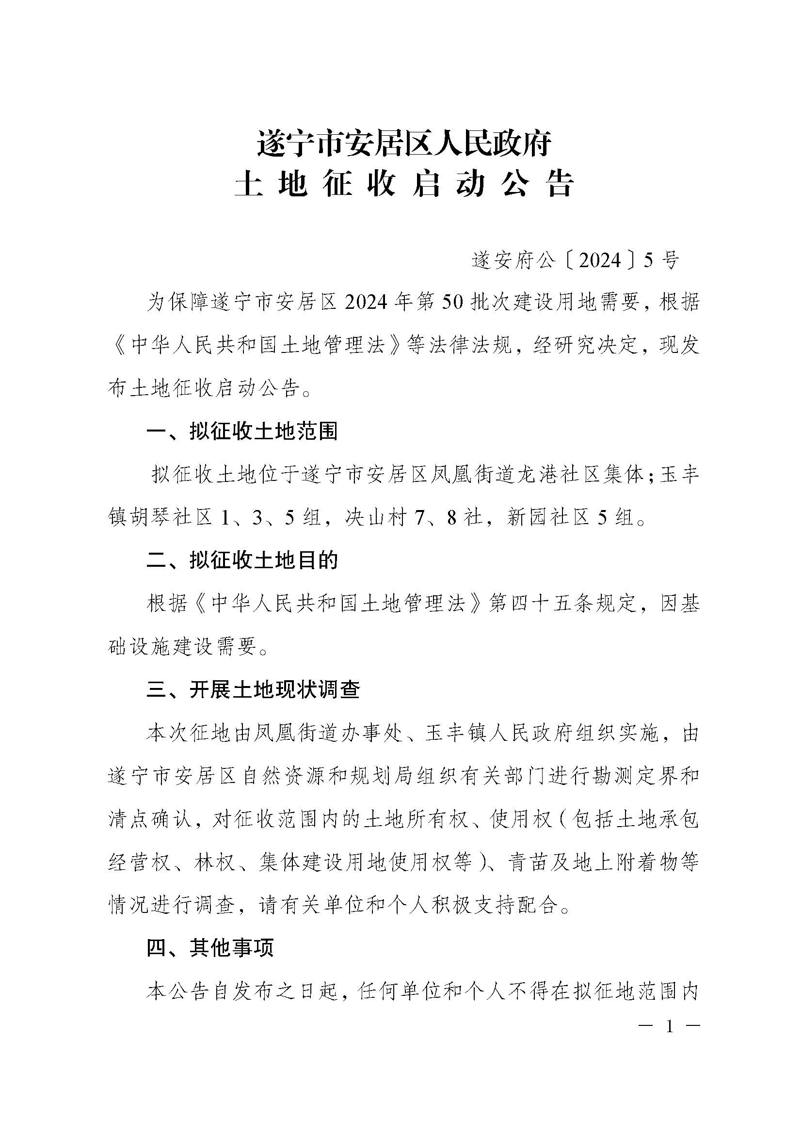 遂宁市安居区人民政府土地征收启动公告 (遂安府公〔2024〕5号)