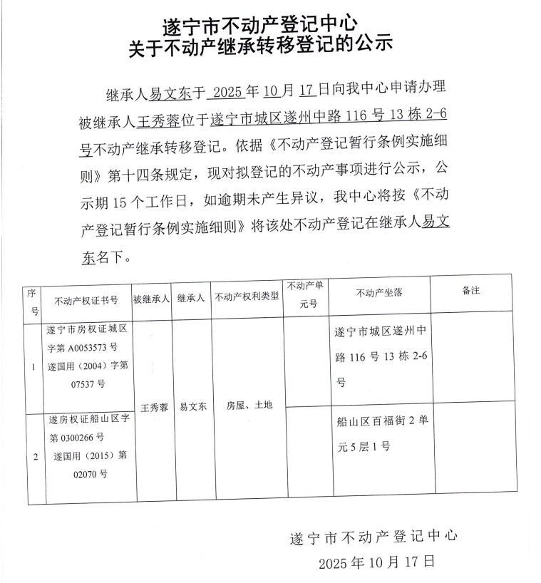遂宁市不动产登记中心关于不动产继承转移登记的公示(易文东)