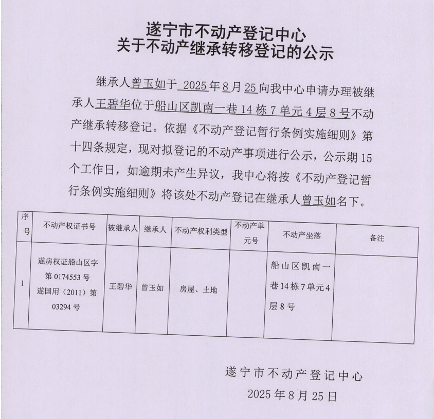 遂宁市不动产登记中心关于不动产继承转移登记的公示(曾玉如)