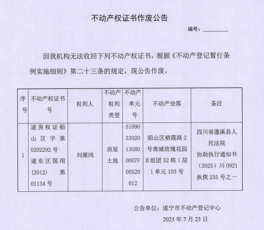 不动产权证书作废公告(刘雁鸿)