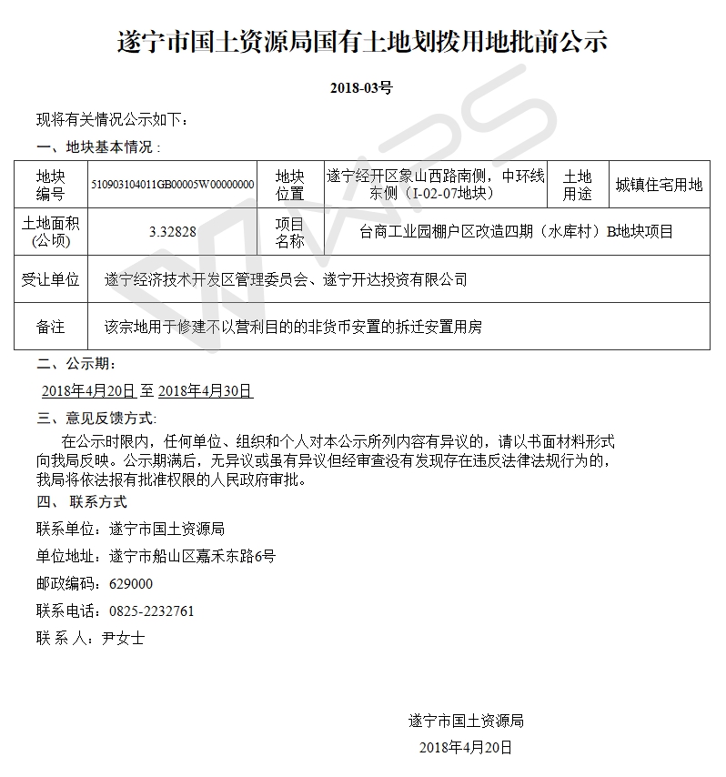 遂宁市国土资源局国有土地划拨用地批前公示(2018-03号)