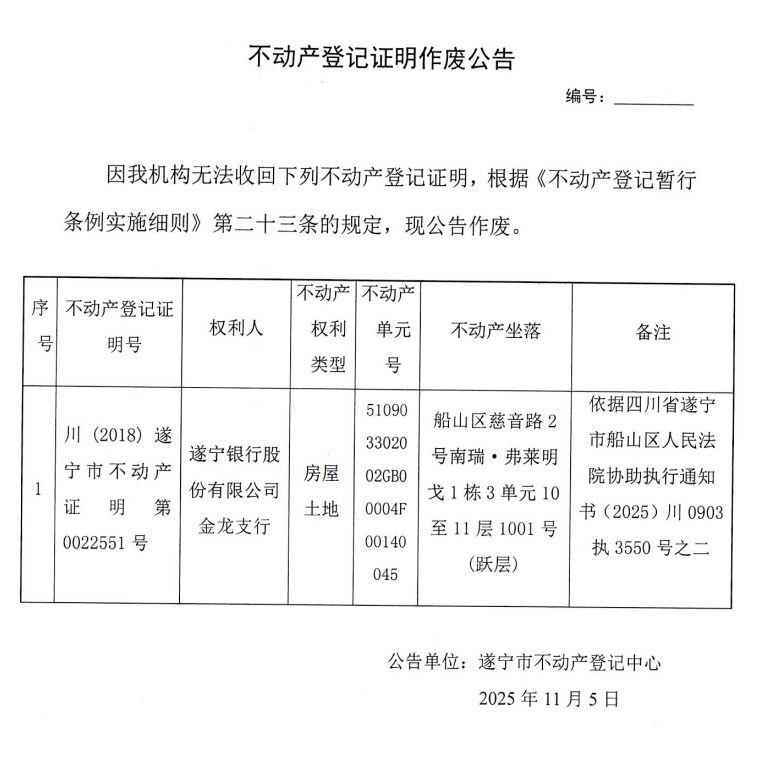不动产登记证明作废公告(遂宁银行股份有限公司金龙支行)