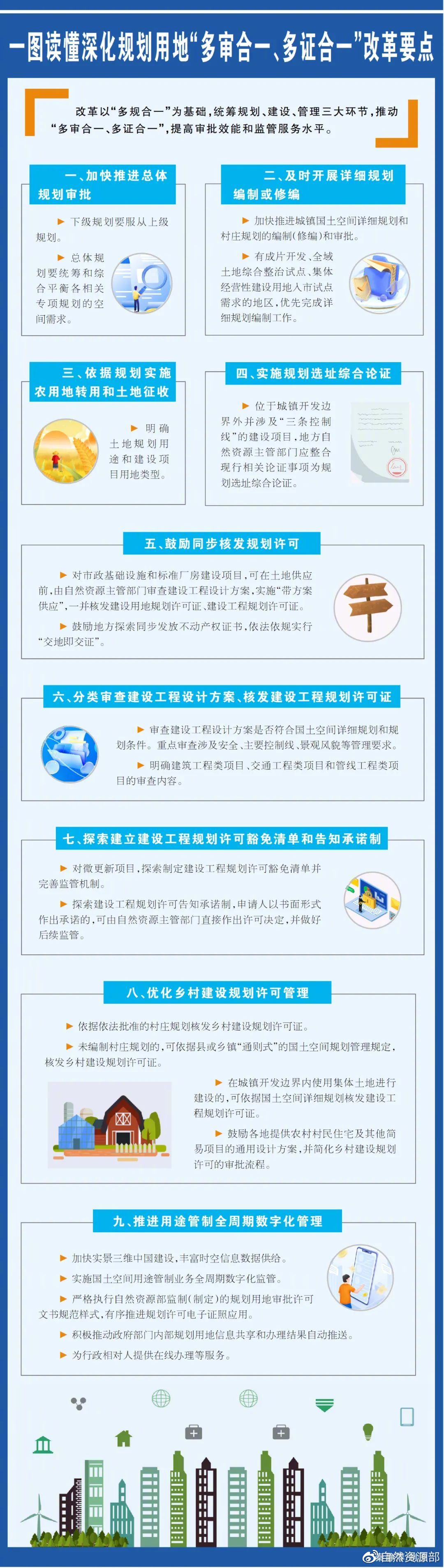 为加强规划许可和用地审批融合管理,推进用途管制制度改革,自然资源部近日印发《关于深化规划用地“多审合一、多证合一”改革的通知》(以下简称《通知》),明确以“多规合一”为基础,以精简审批环节、加强规范管理、提升服务水平为重点,推动“多审合一、多证合一”,提高审批效能和监管服务水平。自然资源部国土空间用途管制司、国土空间规划局、自然资源确权登记局、自然资源所有者权益司、国土测绘司相关负责人,针对新政的出台背景、主要内容、重要作用及其落地实施的保障政策等进行解读。