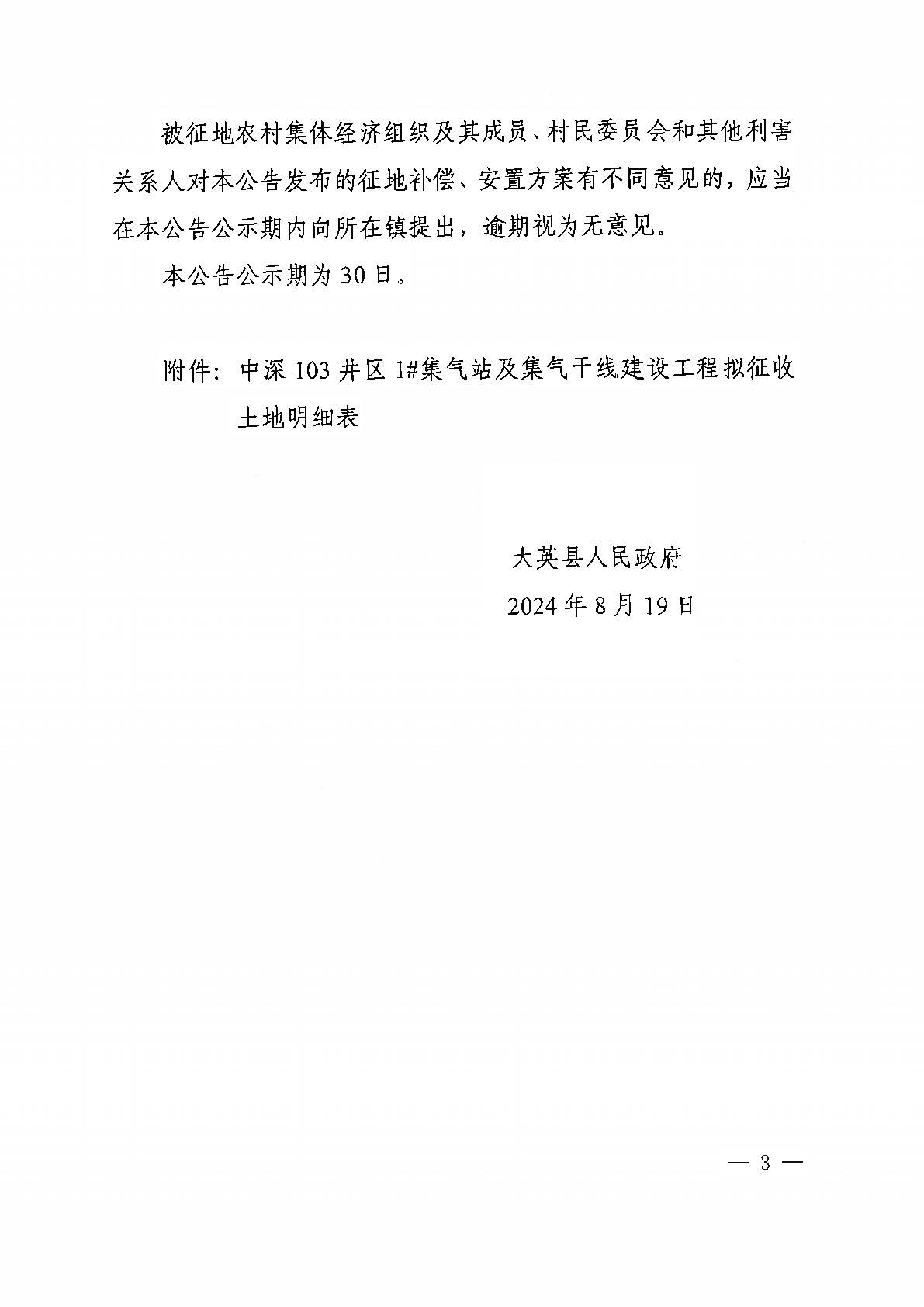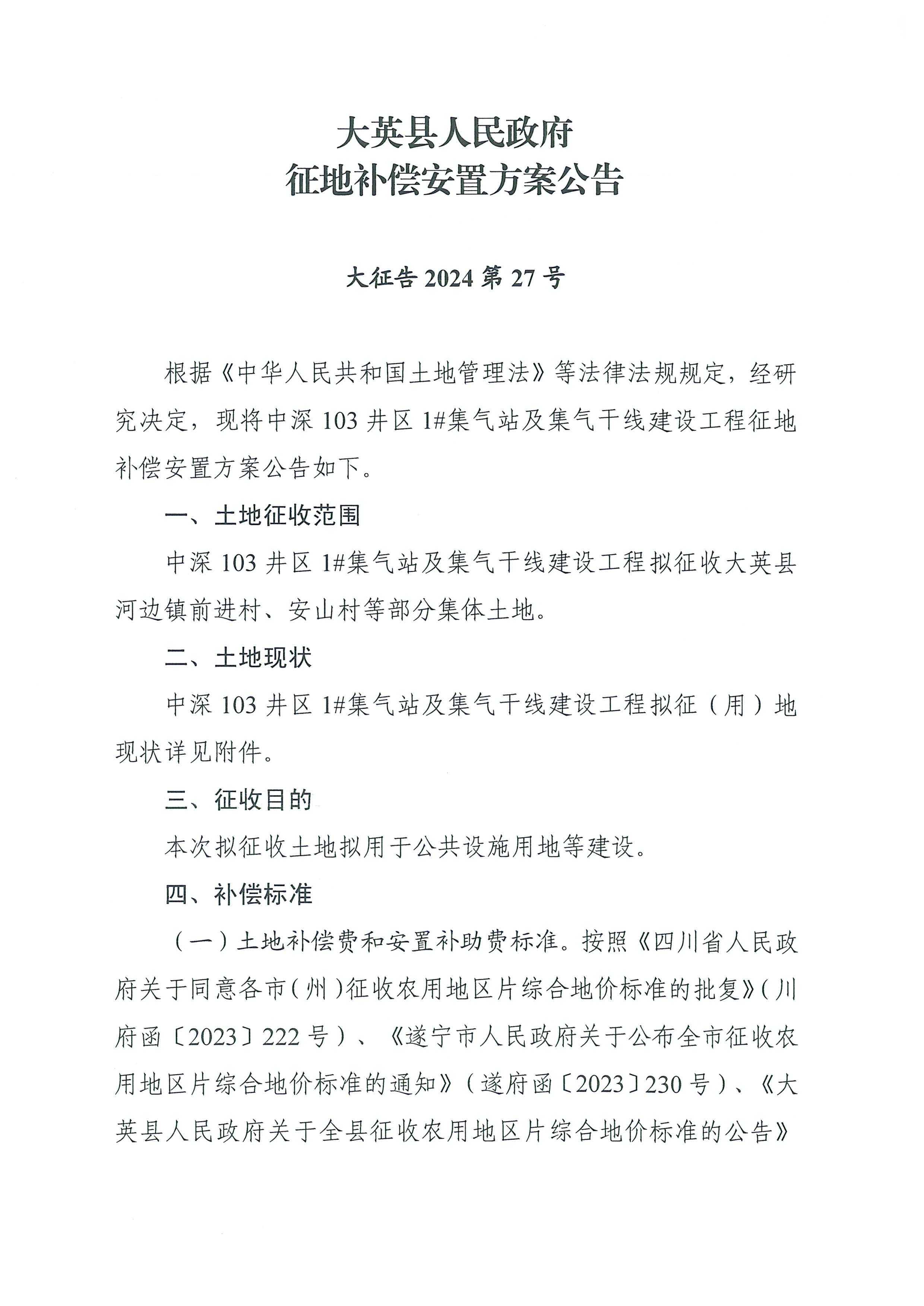 大英县人民政府征地补偿安置方案公告(大征告2024 第27号)
