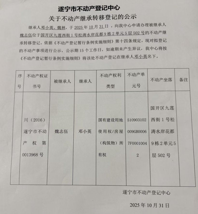 遂宁市不动产登记中心关于不动产继承转移登记的公示(邓小英)