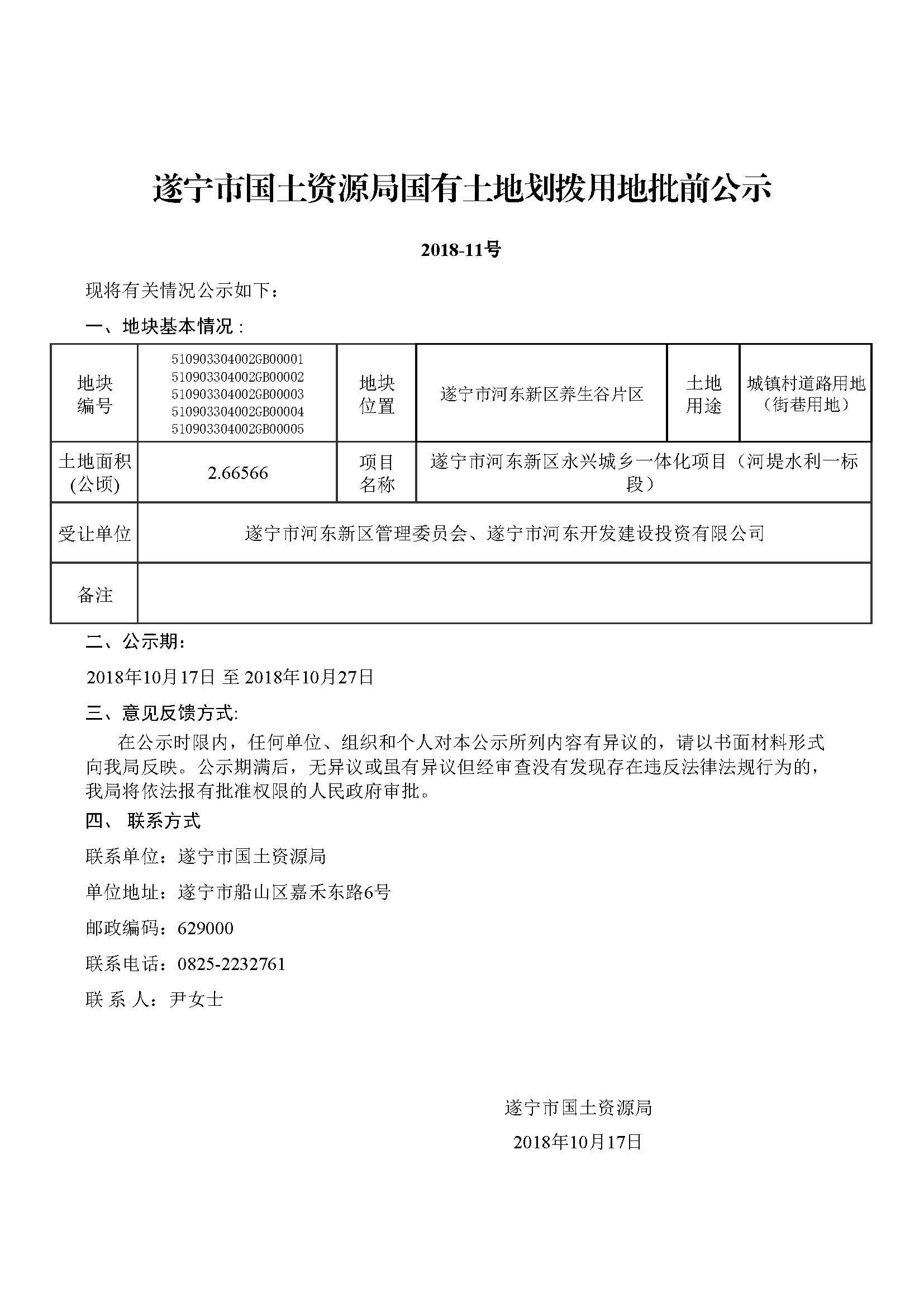 遂宁市国土资源局国有土地划拨用地批前公示(2018-11号)