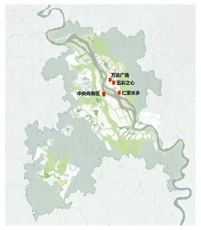 其中一级地标为广德寺、灵泉寺-仁里古镇、龙凤古镇及文创园;二级地标为船山老城区中心商务区,锦华1958创意文化园,体育中心,会展中心。