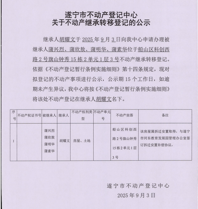 遂宁市不动产登记中心关于不动产继承转移登记的公示(胡耀文)