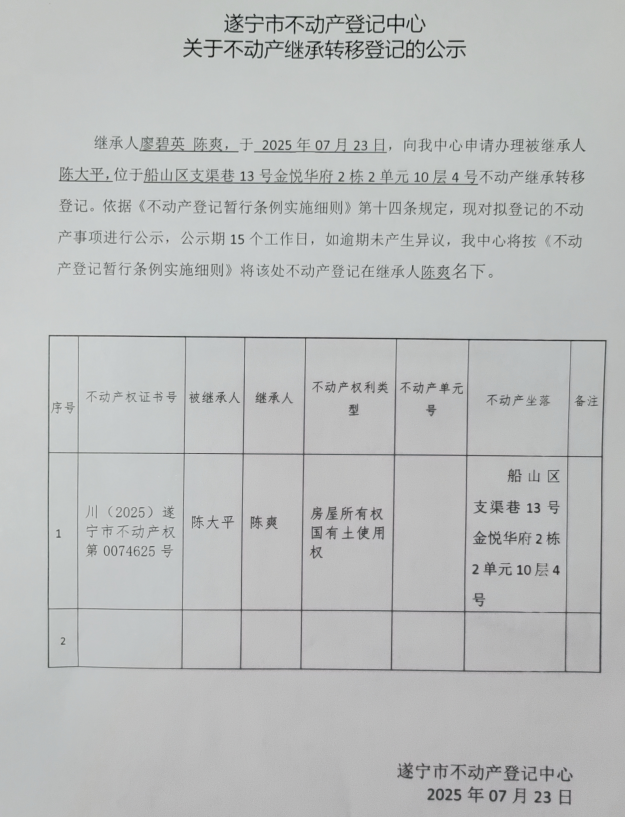 遂宁市不动产登记中心关于不动产继承转移登记的公示(陈爽)