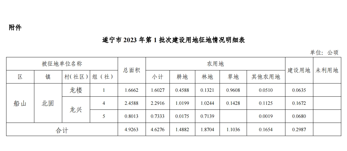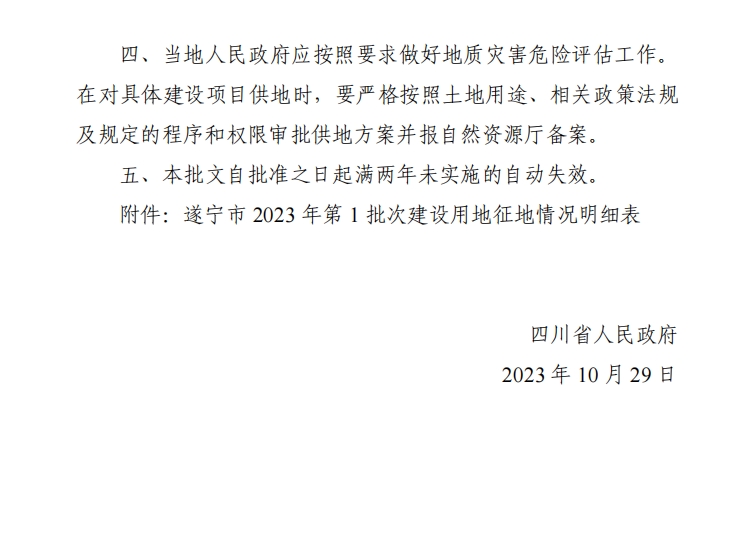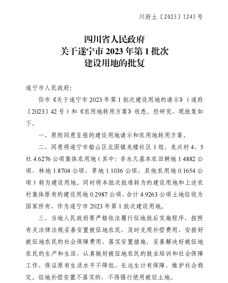 四川省人民政府关于遂宁市2023年第1批次建设用地的批复(川府土〔2023〕1243号)