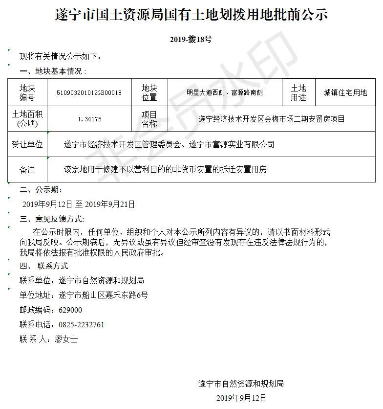 遂宁市国土资源局国有土地划拨用地批前公示(2019-拨18号)