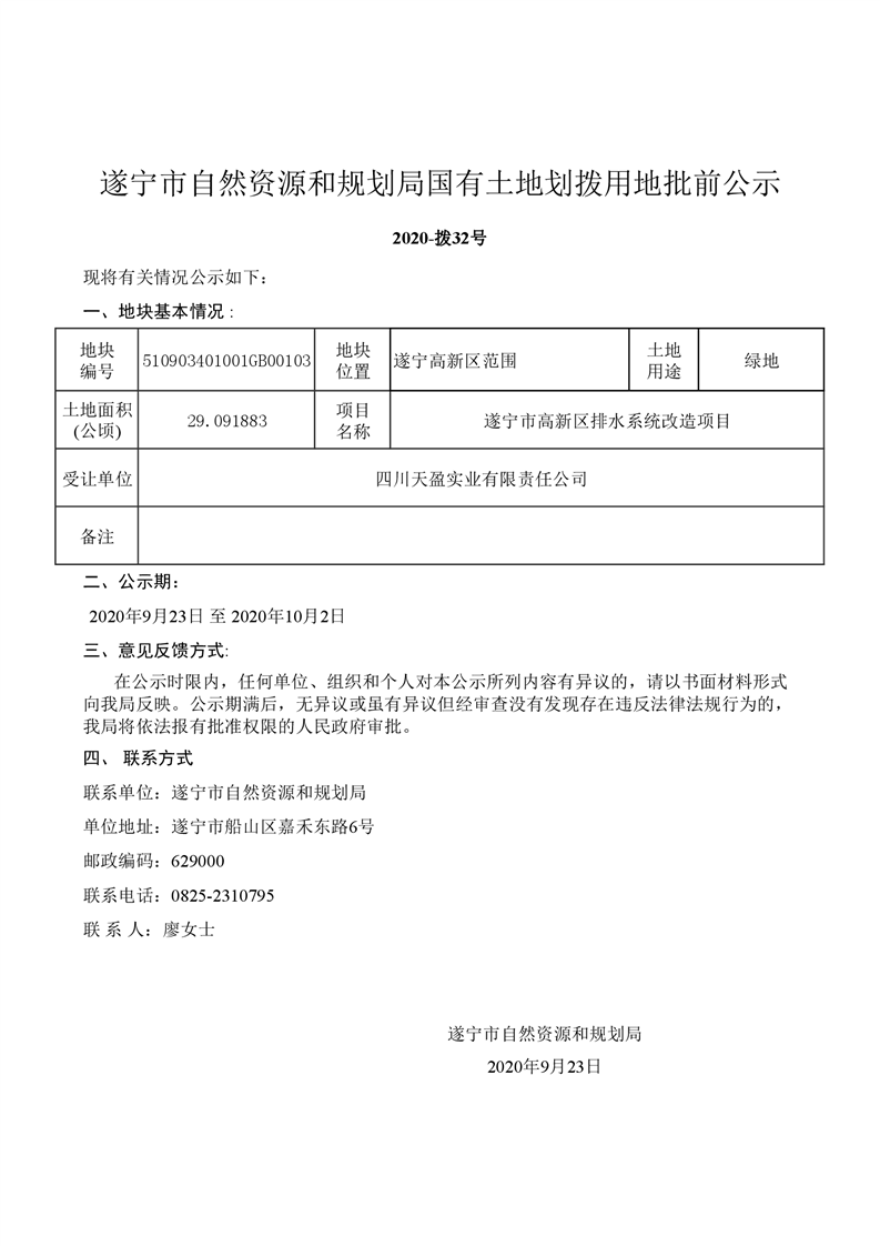 遂宁市自然资源和规划局国有土地划拨用地批前公示2020-拨32号