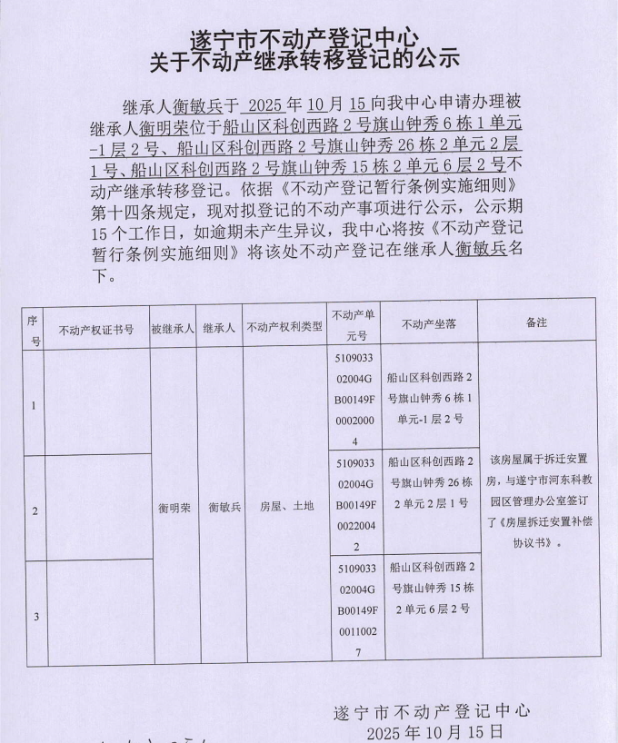 遂宁市不动产登记中心关于不动产继承转移登记的公示(衡敏兵)