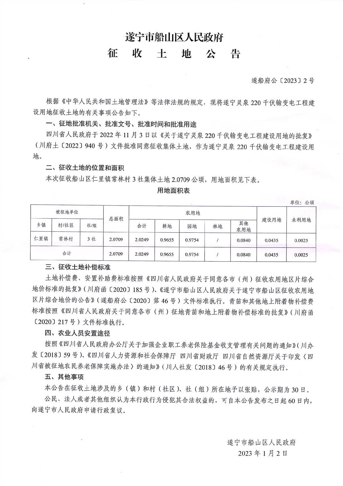 遂宁市船山区人民政府征收土地公告(遂船府公〔2023〕2号)遂宁灵泉220千伏输变电工程