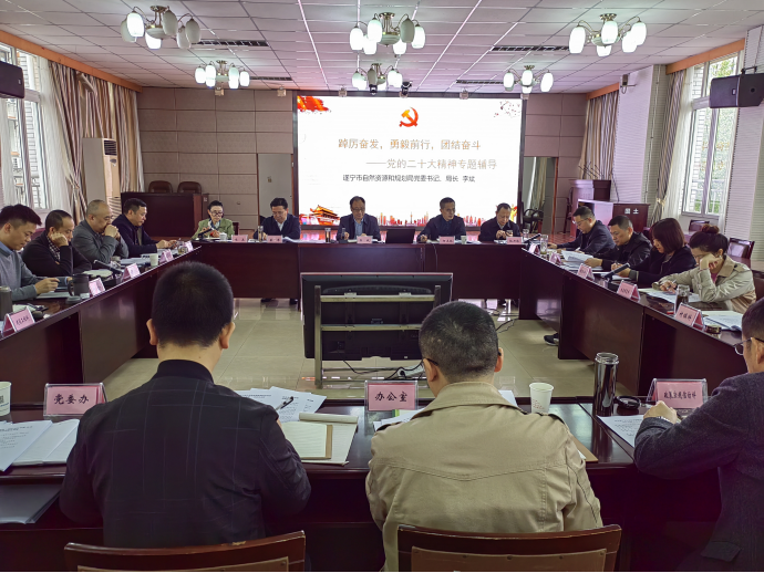 2022年11月10日,遂宁市自然资源和规划局召开党委理论学习中心组扩大学习会议,专题学习党的二十大精神,党委书记、局长李斌以“踔厉奋发,勇毅前行,团结奋斗”为主题作专题辅导,局班子成员结合工作实际交流学习心得体会。局机关各科室、所属事业单位负责人参加学习。