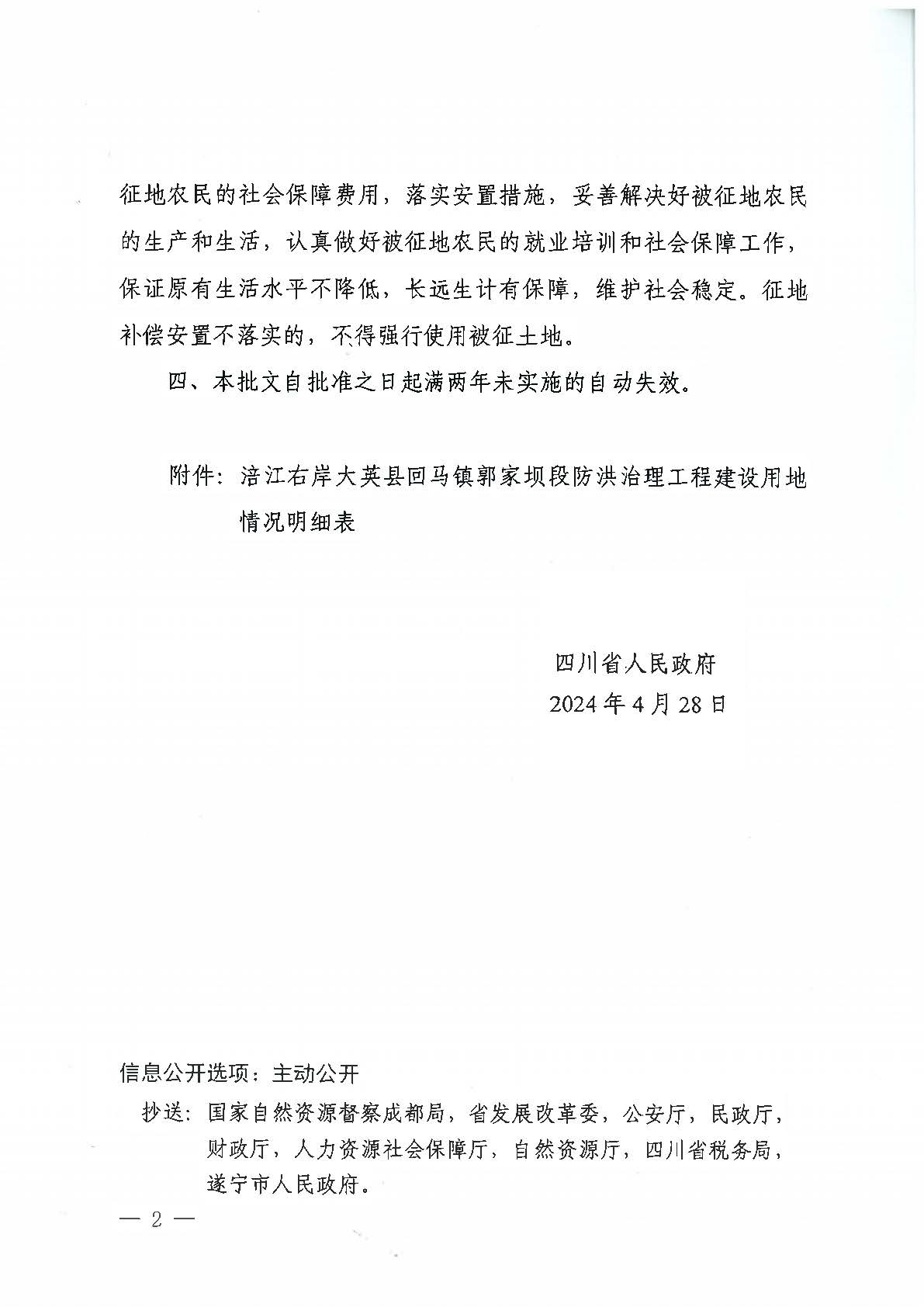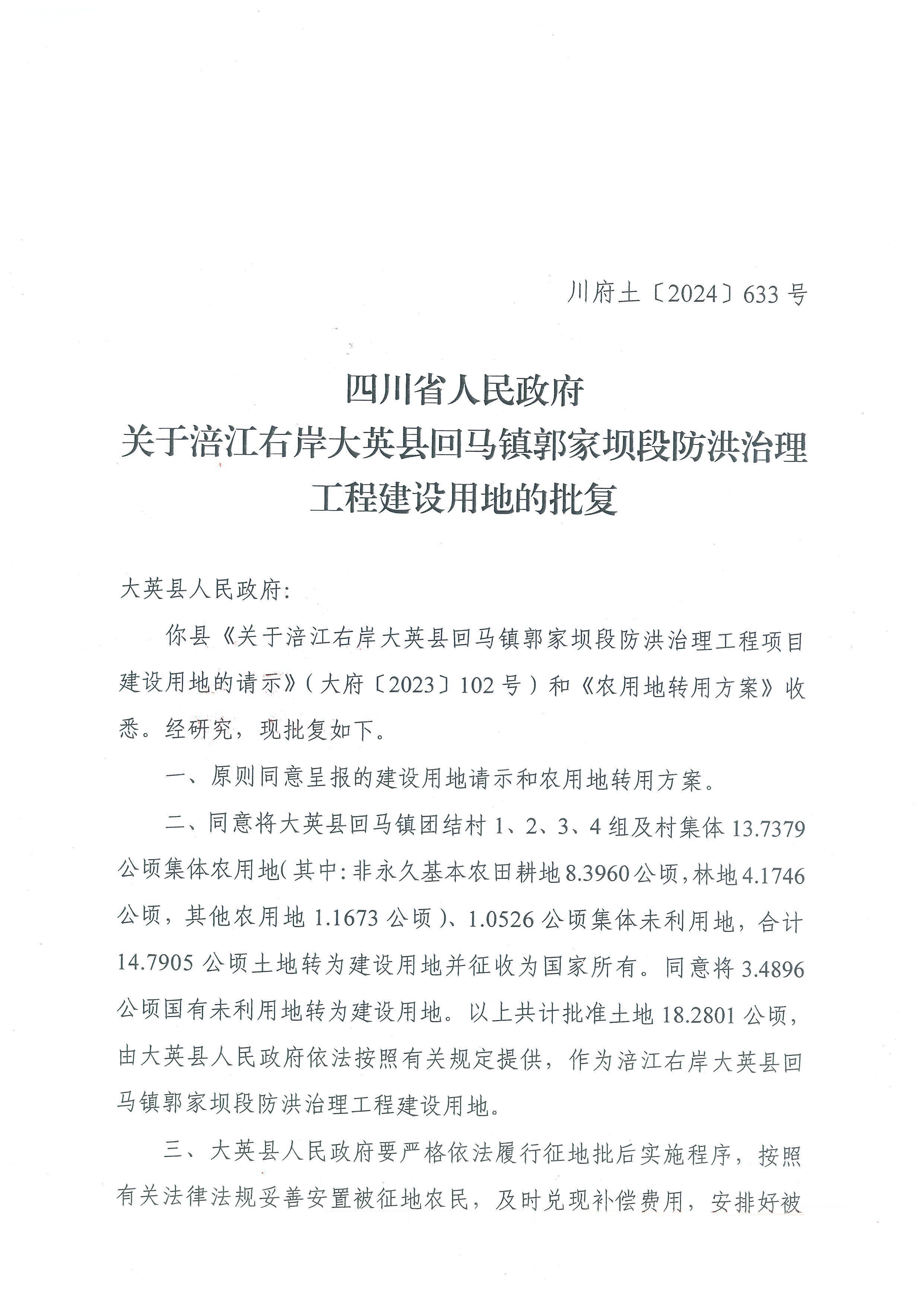 四川省人民政府关于涪江右岸大英县回马镇郭家坝段防洪治理工程建设用地的批复(川府土〔2024〕633号)