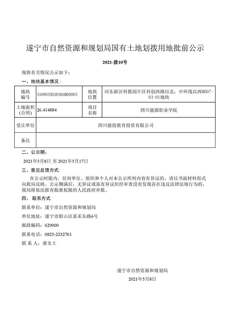 遂宁市自然资源和规划局国有土地划拨用地批前公示2021-拨10号