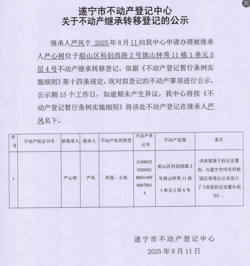 遂宁市不动产登记中心关于不动产继承转移登记的公示(严凤)