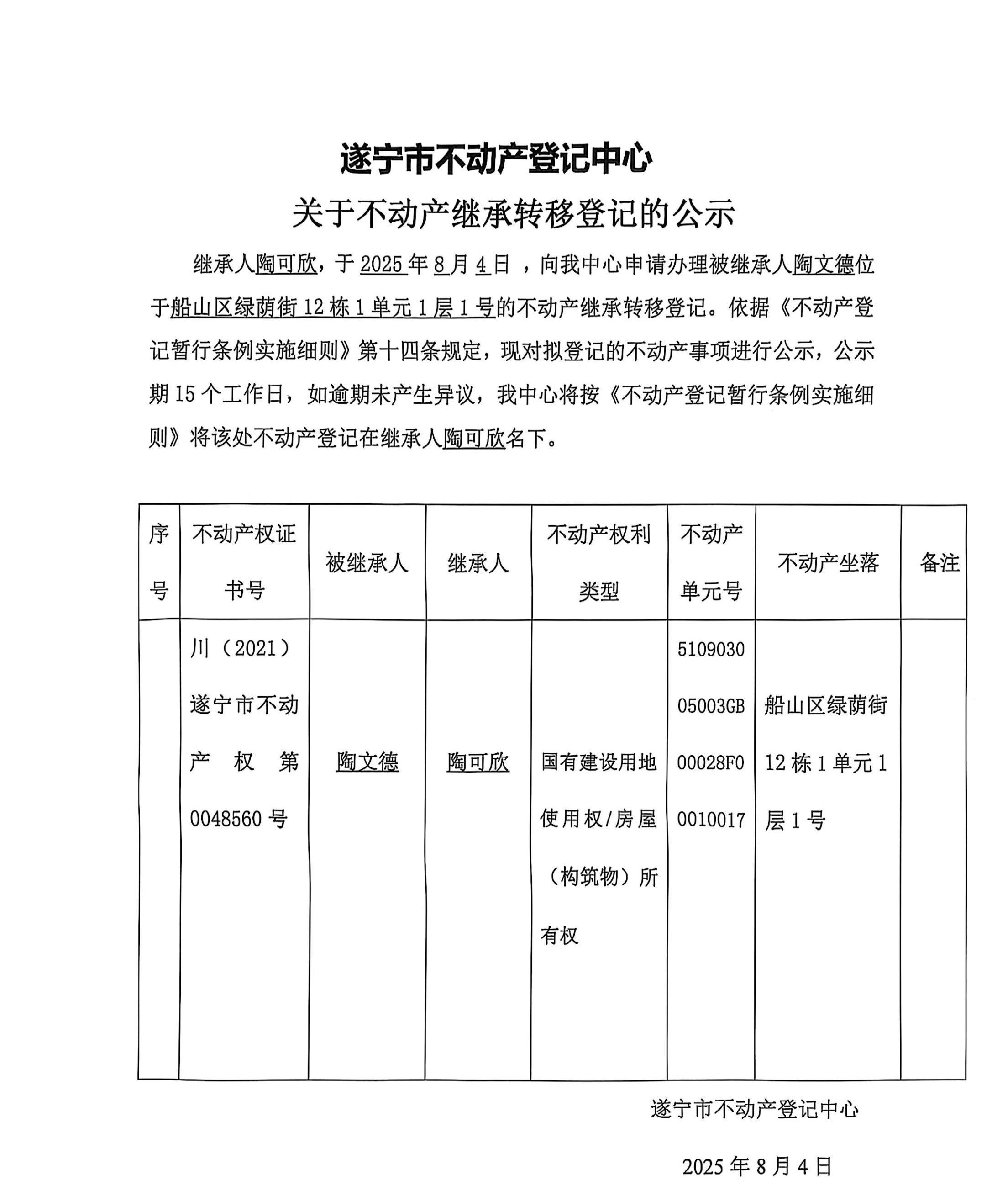 遂宁市不动产登记中心关于不动产继承转移登记的公示(陶可欣)