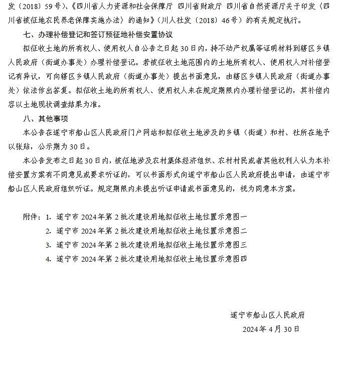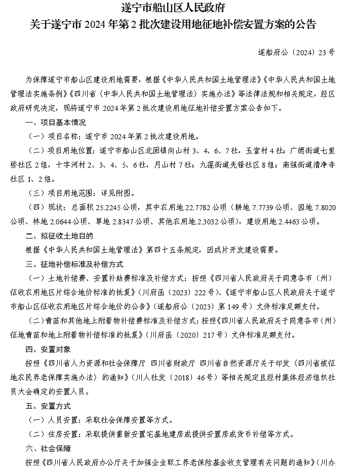 遂宁市船山区人民政府关于遂宁市2024年第2批次建设用地征地补偿安置方案的公告(遂船府公〔2024〕23号)