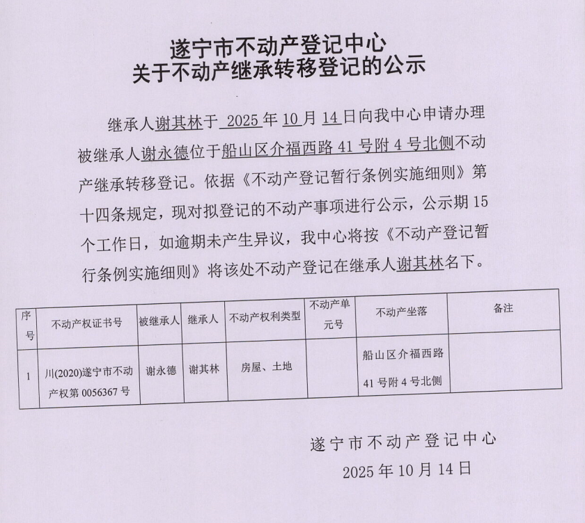 遂宁市不动产登记中心关于不动产继承转移登记的公示(谢其林)