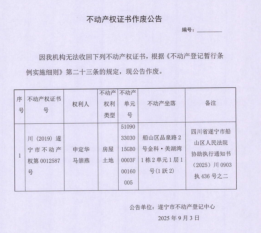 不动产权证书作废公告(申定华、马崇燕)