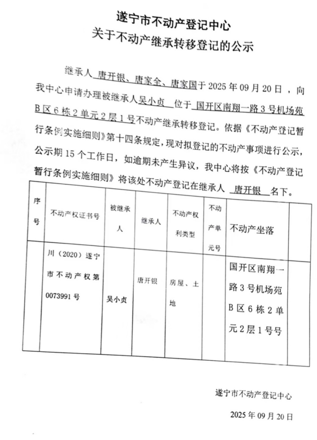 遂宁市不动产登记中心关于不动产继承转移登记的公示(唐开银)