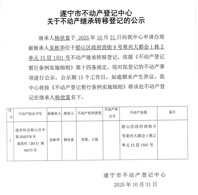 遂宁市不动产登记中心关于不动产继承转移登记的公示(杨世富)