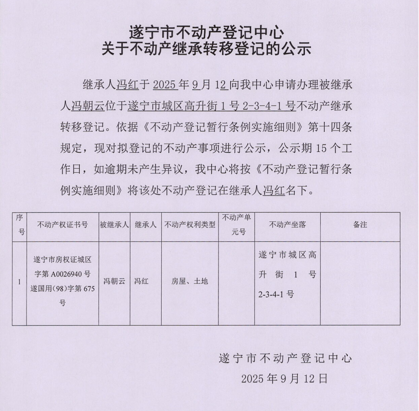 遂宁市不动产登记中心关于不动产继承转移登记的公示(冯红)