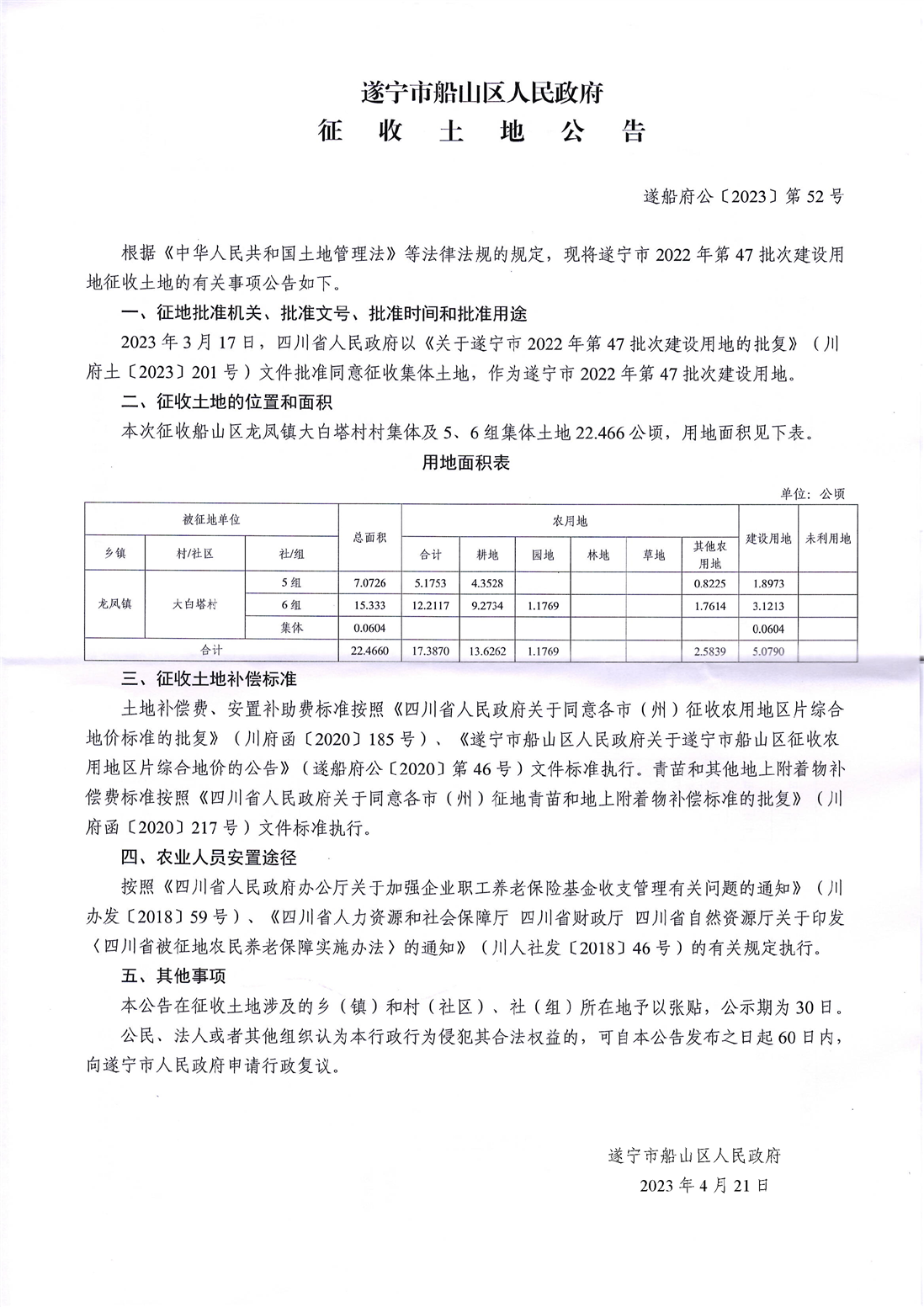 遂宁市船山区人民政府征收土地公告(遂船府公〔2023〕第52号)