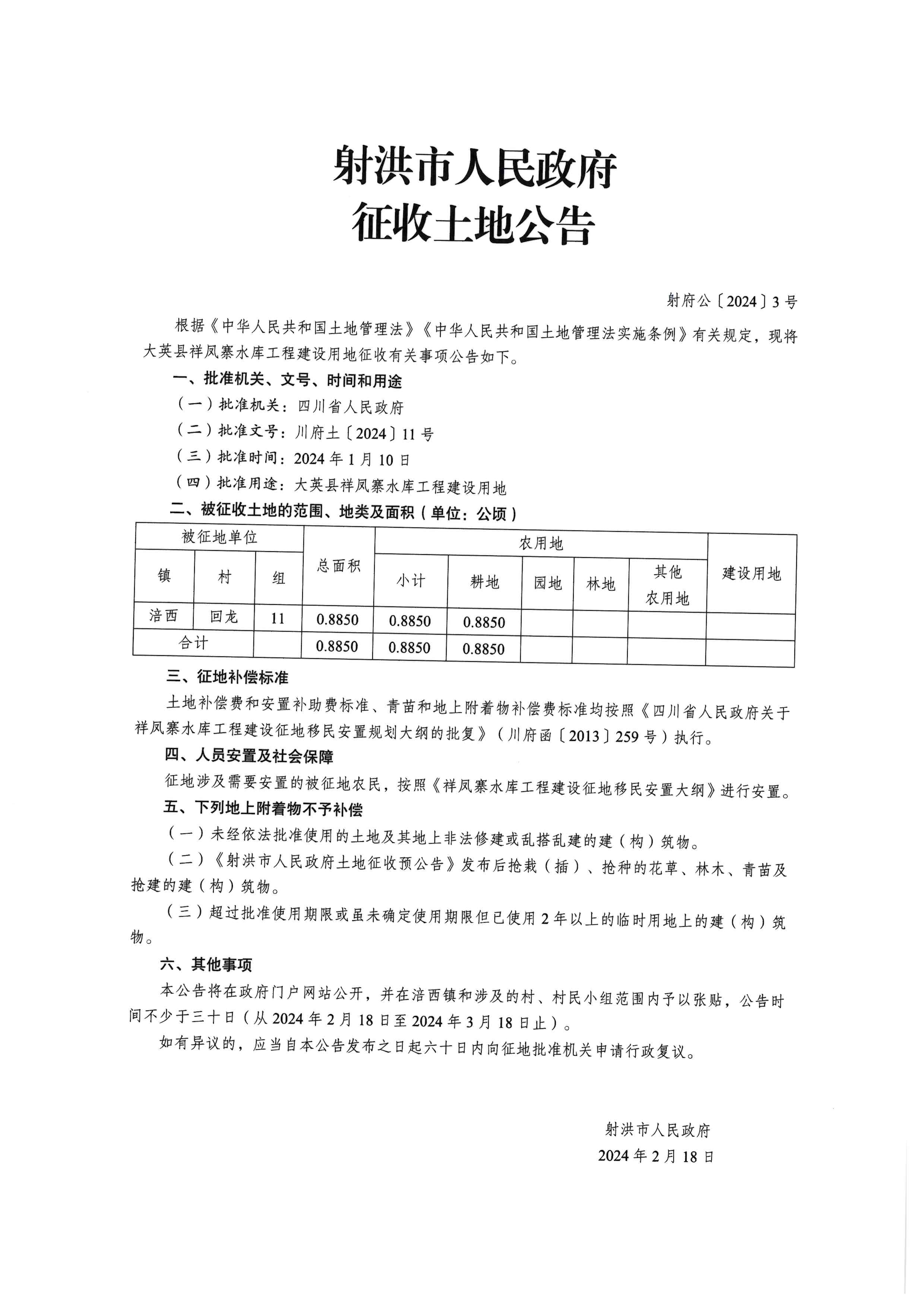 射洪市人民政府征收土地公告(射府公〔2024〕3号)