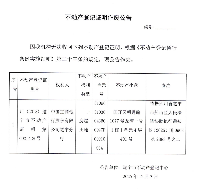不动产登记证明作废公告(中国工商银行股份有限公司遂宁分行)