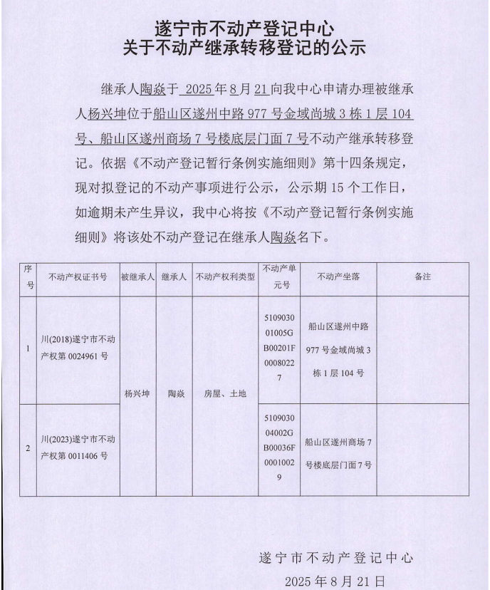 遂宁市不动产登记中心关于不动产继承转移登记的公示(陶焱)