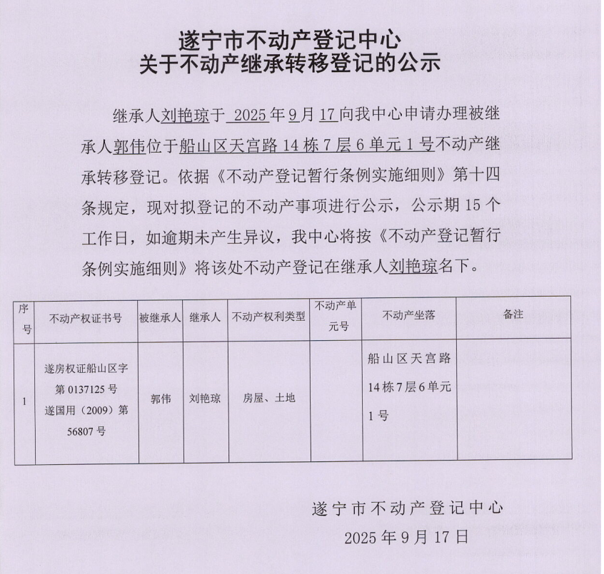 遂宁市不动产登记中心关于不动产继承转移登记的公示(刘艳琼)