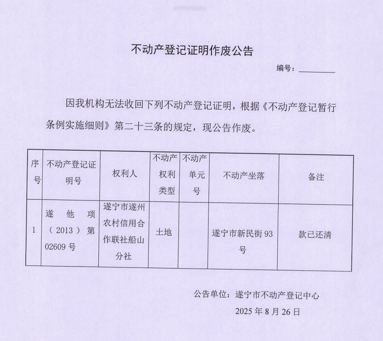 不动产登记证明作废公告(遂宁市遂州农村信用合作联社船山分社)