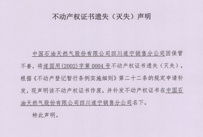 不动产权证书遗失(灭失)声明(中国石油天然气股份有限公司四川遂宁销售分公司)