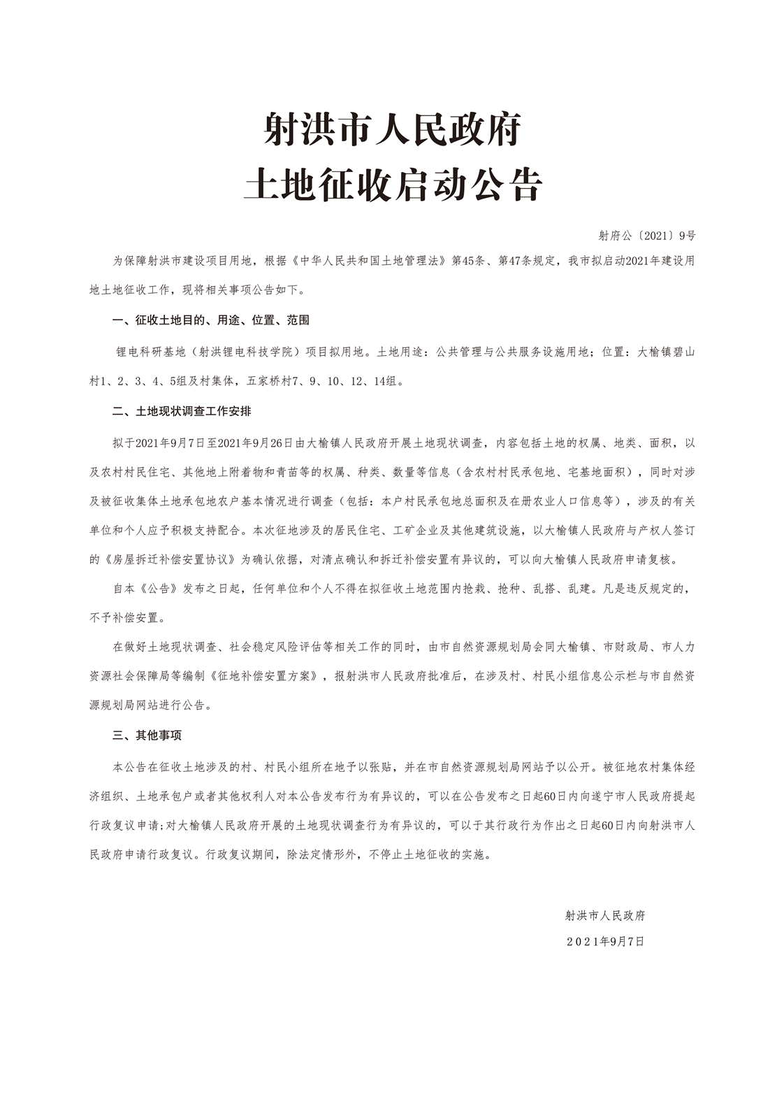 射洪市人民政府土地征收启动公告(射府公〔2021〕9号)