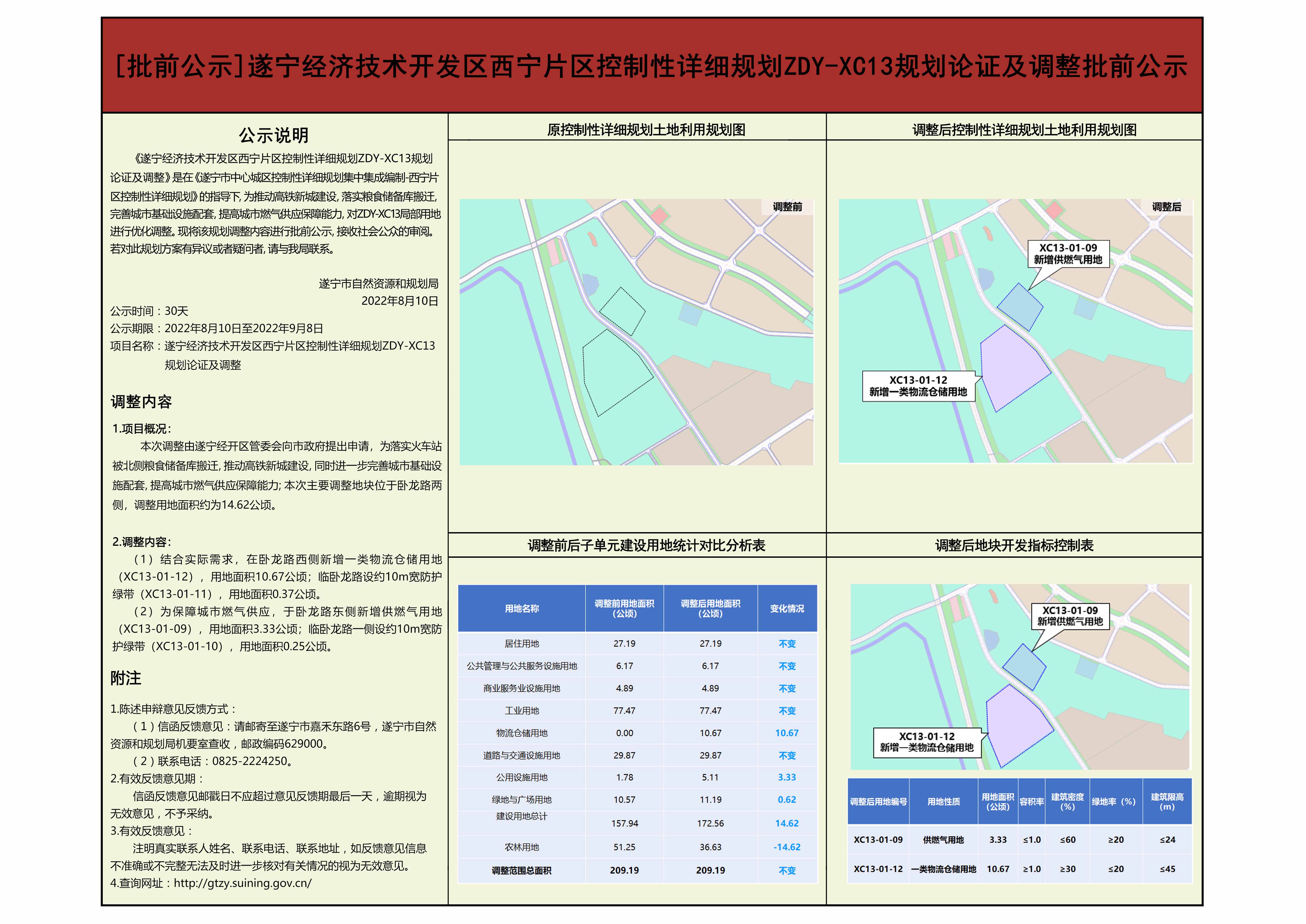 《遂宁经济技术开发区西宁片区控制性详细规划ZDY-XC13规划论证及调整》是在《遂宁市中心城区控制性详细规划集中集成编制-西宁片区控制性详细规划》的指导下,为推动高铁新城建设,落实粮食储备库搬迁,完善城市基础设施配套,提高城市燃气供应保障能力,对ZDY-XC13局部用地进行优化调整。现将该规划调整内容进行批前公示,接收社会公众的审阅。若对此规划方案有异议或者疑问者,请与我局联系。