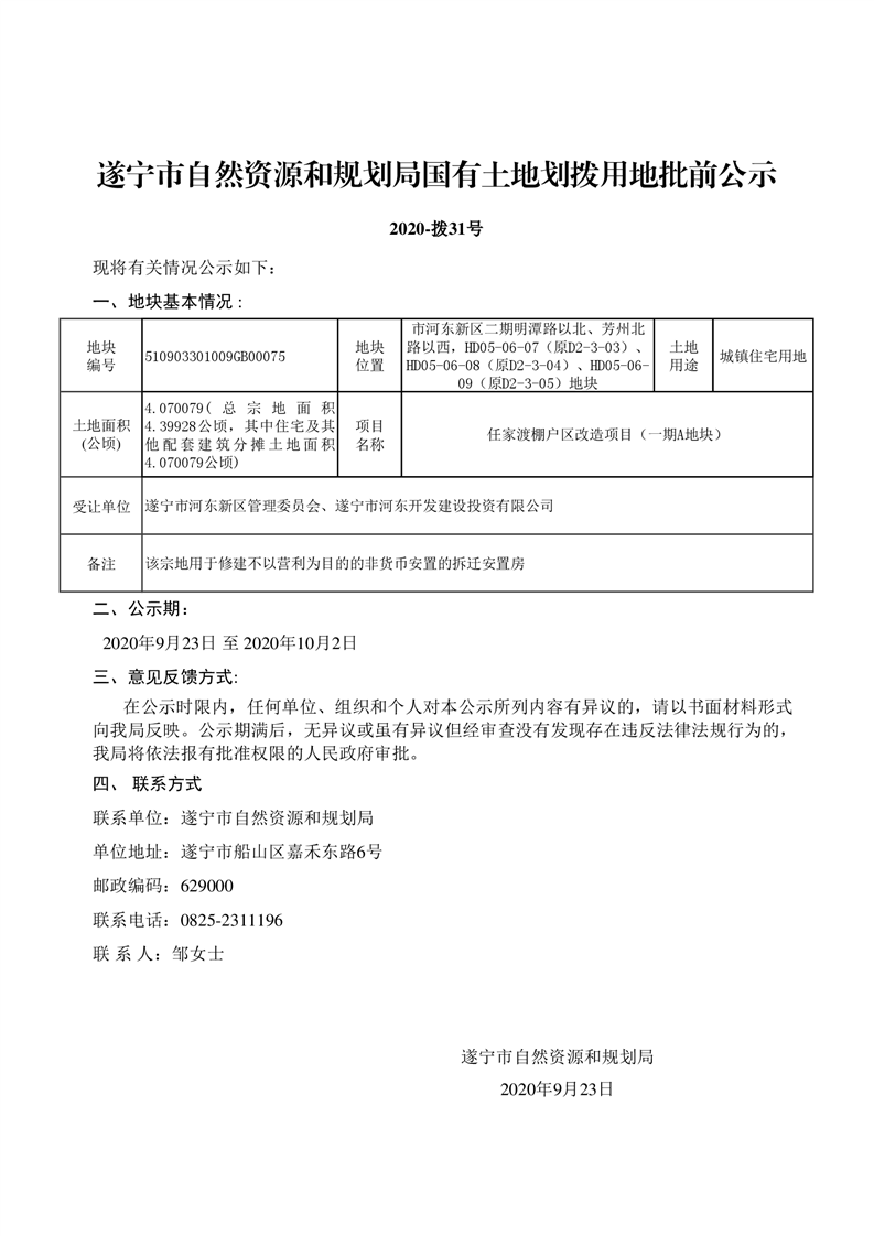 遂宁市自然资源和规划局国有土地划拨用地批前公示(2020-拨31号)