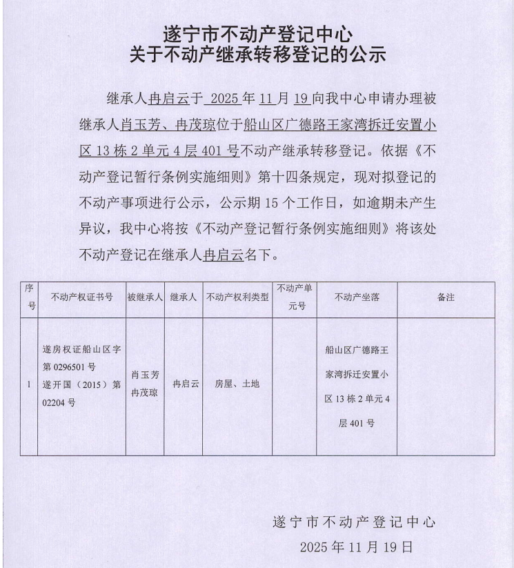 遂宁市不动产登记中心关于不动产继承转移登记的公示(冉启云)