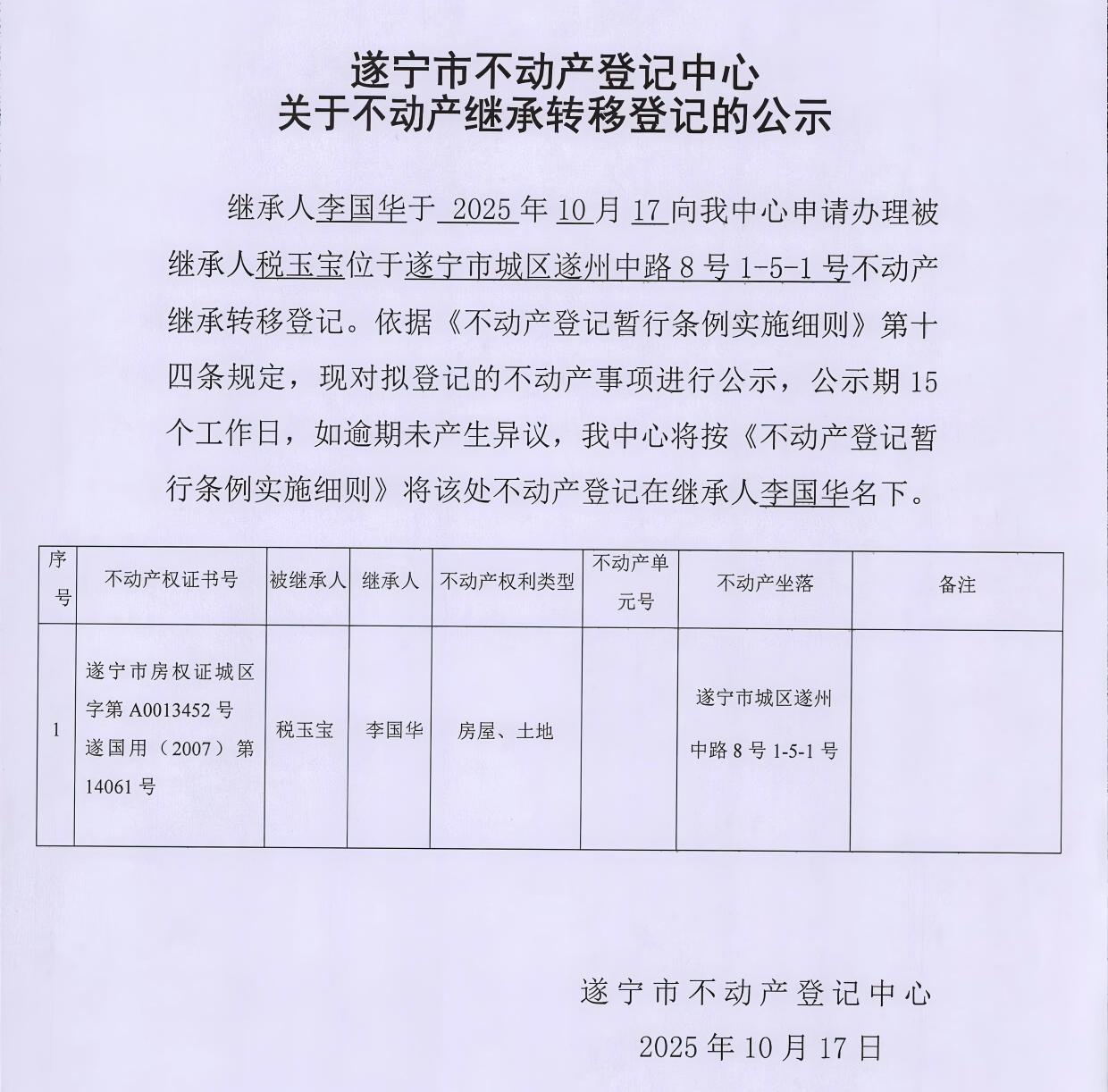 遂宁市不动产登记中心关于不动产继承转移登记的公示(李国华)