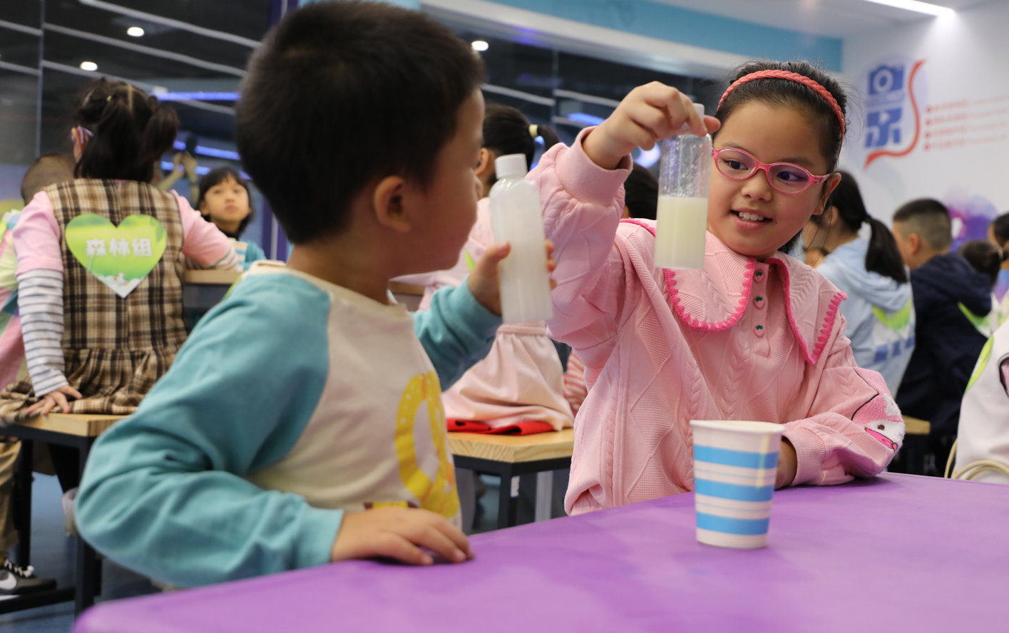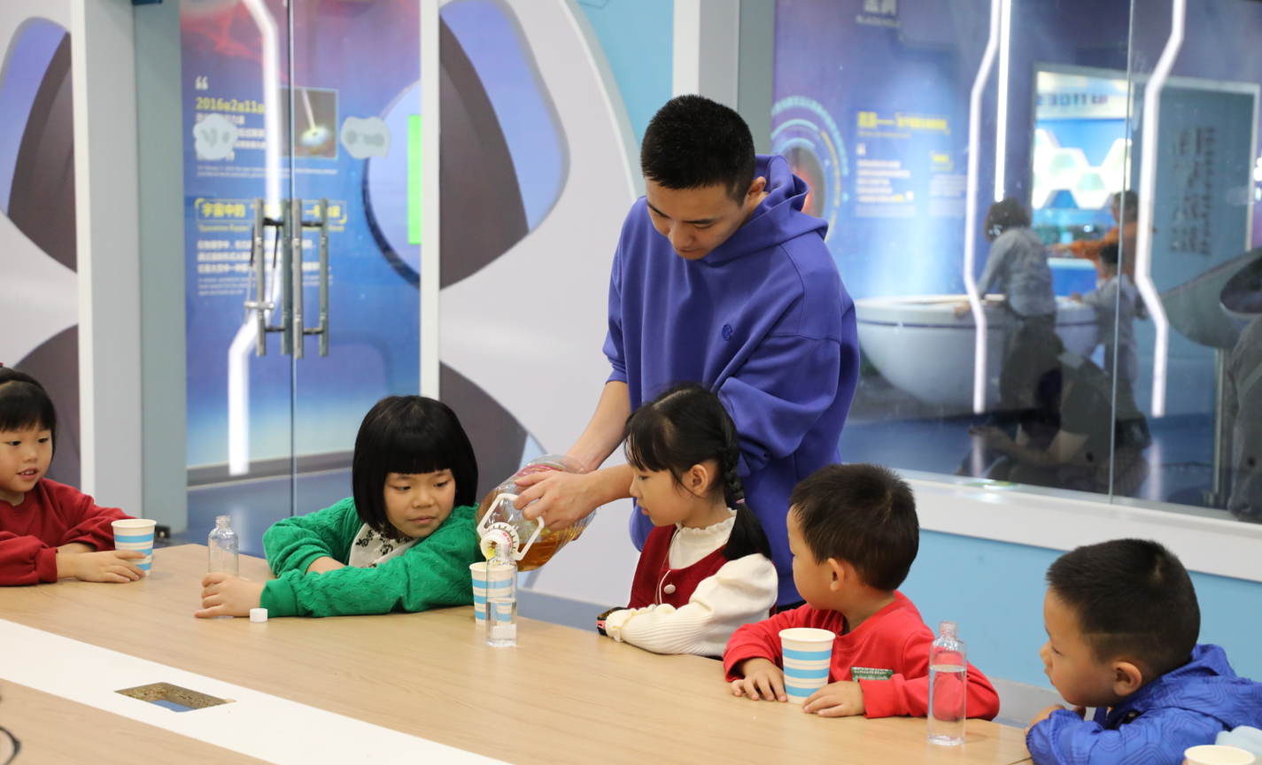 小朋友们在科技馆老师的带领下,了解中国空间站的发展历程、构造,进行了水油分离试验。