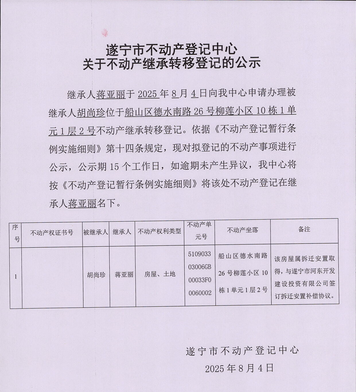 遂宁市不动产登记中心关于不动产继承转移登记的公示(蒋亚丽)